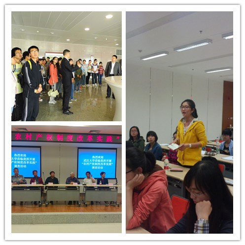 在实践调研活动中,武汉农村综合产权交易所副总经理关俊波先生带领同学们参观了农交所服务窗口和交易大厅,并介绍了交易所的发展历程和基本情况。参观活动结束后,武大师生同来自武汉地区的农业企业家、家庭农场主、基层农村干部和武汉农村综合产权交易所工作人员就农村土地流转、农业产业化、新农村建设等涉农问题进行了座谈。在座谈中,武汉群益绿色生态园林科技发展有限公司郑先奎先生、武汉市黄陂区六指街滨湖村民委员会郑庆先先生,武汉市黄陂区家庭农场的李伟和先生、武汉康馨源农业科技发展有限责任公司沈汉闻先生等现身说法,向武大师生介绍了农村产权交易所在他们从事农业生产经营中发挥的重大作用。同学们也踊跃发言,提出自己的观点和问题,与座谈嘉宾进行了愉快交流。