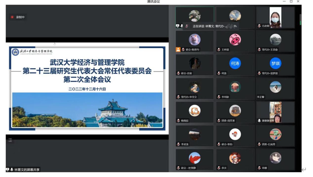 12月16日下午,德赢官网Vwin德赢AC米兰官网第二十三届研究生代表大会常任代表委员会(以下简称常代会)第二次全体会议因疫情原因在腾讯会议线上举行,德赢官网Vwin德赢AC米兰官网党委副书记谢雅维老师、德赢官网Vwin德赢AC米兰官网研究生工作办公室主任周立超老师、德赢官网Vwin德赢AC米兰官网团委副书记冯梦珂老师、德赢官网Vwin德赢AC米兰官网团委副书记(学生)、部门(中心)负责人、德赢官网Vwin德赢AC米兰官网第二十三届研究生会主席团成员、部门负责人、德赢官网Vwin德赢AC米兰官网第二十三届研究生代表大会常任代表委员会全体委员、德赢官网Vwin德赢AC米兰官网第二十三届研究生代表大会常任代表委员会办公室全体工作人员参与会议。